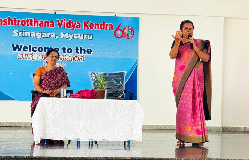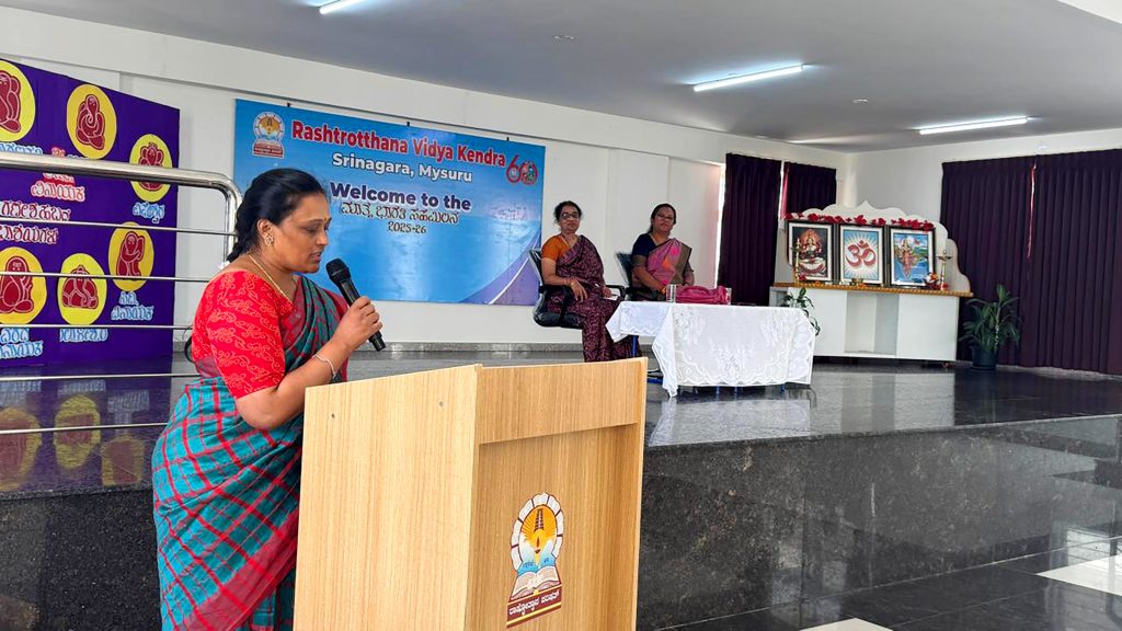 Mysuru, Aug. 30: Rashtroththan Vidya Kendra – Srinagar organized its annual Matrubharti Meeting 2025-26 on Saturday. Smt. Sadhana Tantri was the chief guest. The Pradhanacharya explained Matrubharti’s vision in empowering mothers. Chief guest Smt. Sadhana Tantri hailed mothers as “the first teachers and guiding lights”.