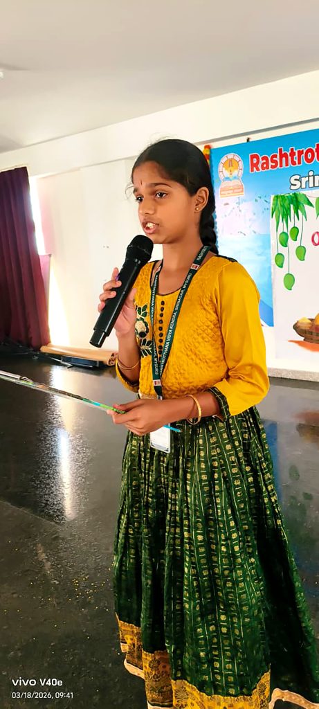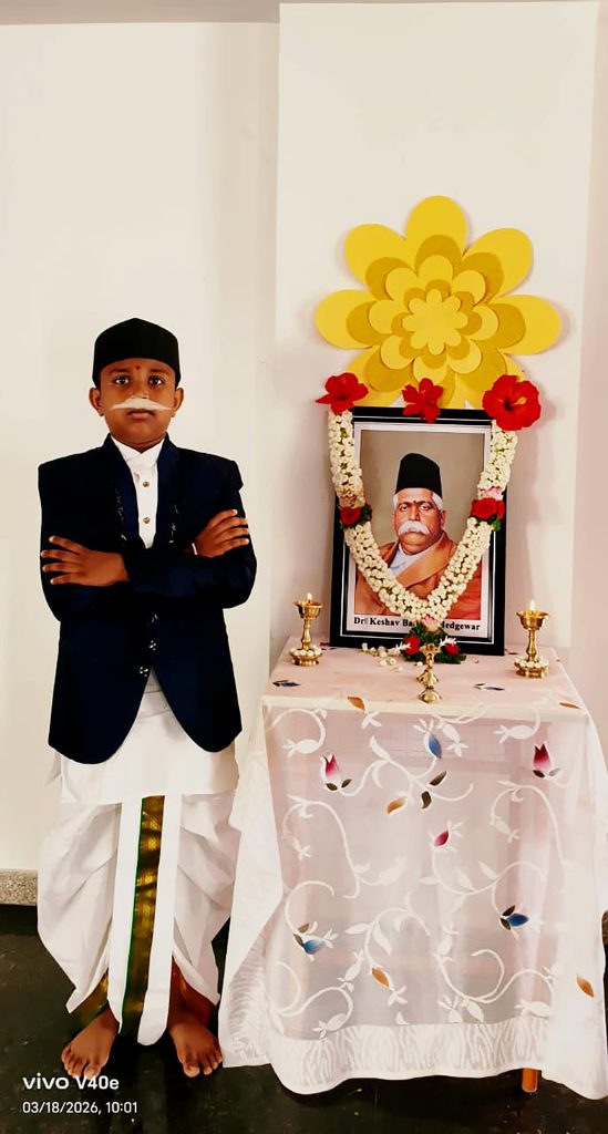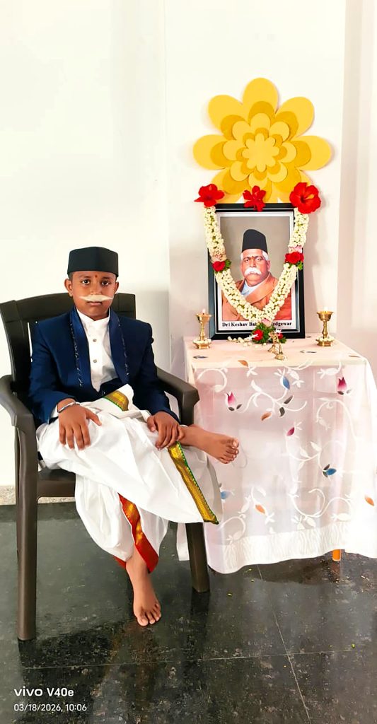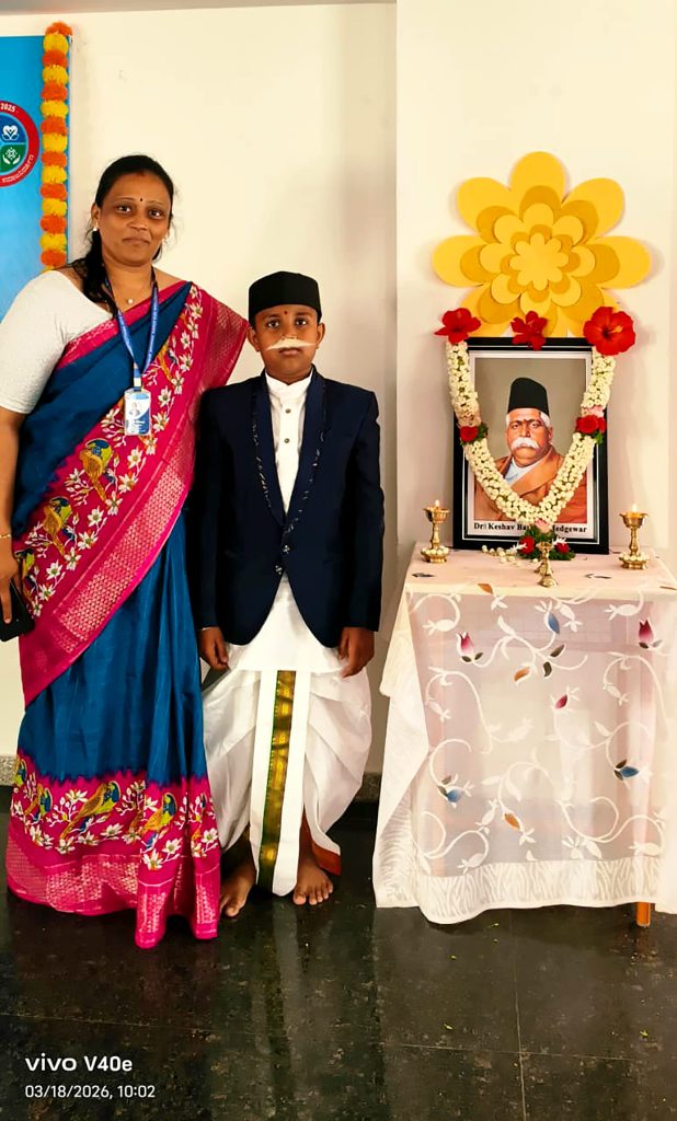 Mysuru, Mar. 18: The birth anniversary of Dr Keshav Baliram Hedgewar, founder of the Rashtriya Swayamsevak Sangh (RSS), was celebrated at Rashtrotthana Vidya Kendra – Srinagar. Students dressed up as Dr Hedgewar and delivered a speech highlighting the importance of values like patriotism, selfless service and character building.